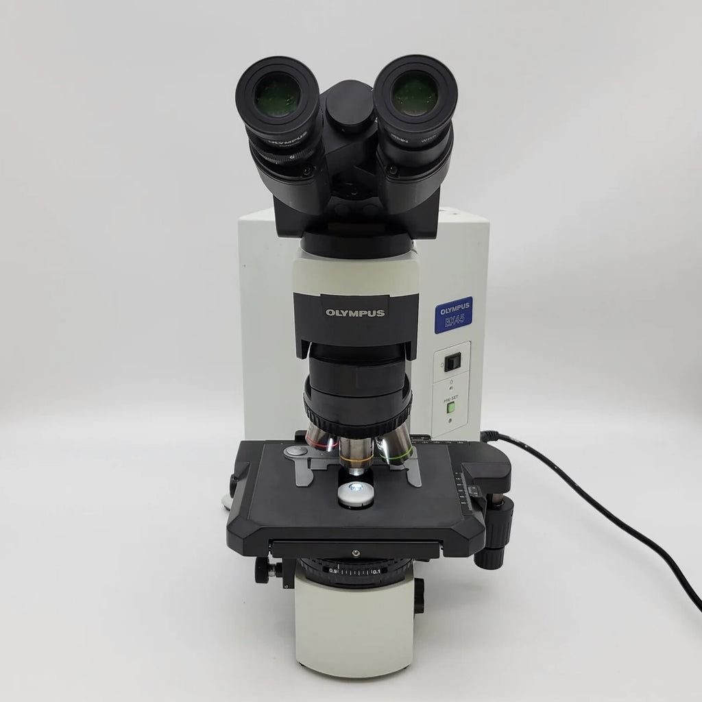The Olympus BX45 is a popular pathology/dermatology microscope due to its ergonomic low-position mechanical stage. This has Plan N 2x, 4x, 10x, 40x, objectives, but we can provide others if needed. This comes with a right-handed XY mechanical stage with a slide holder. The microscope is equipped with a flip-out condenser for use with the 2x objective lens.